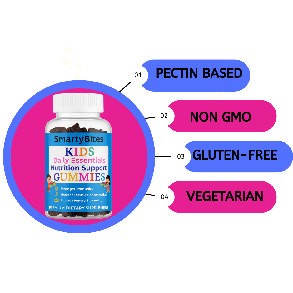 Unlike ordinary supplements, SmartyBites are kid-friendly gummies that taste great — making kids excited to take them daily. They also combine both brain-boosting + immunity support in one formula, giving your child a complete advantage.